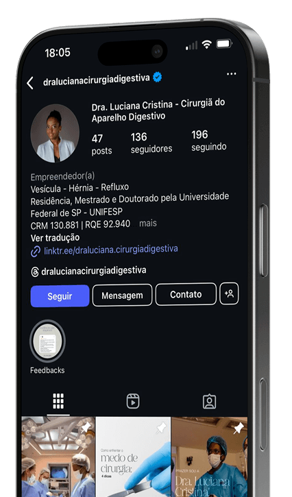 Veja mais sobre o dia a dia da Dra. Luciana, dicas de saúde digestiva, depoimentos e bastidores das cirurgias realizadas com sucesso.